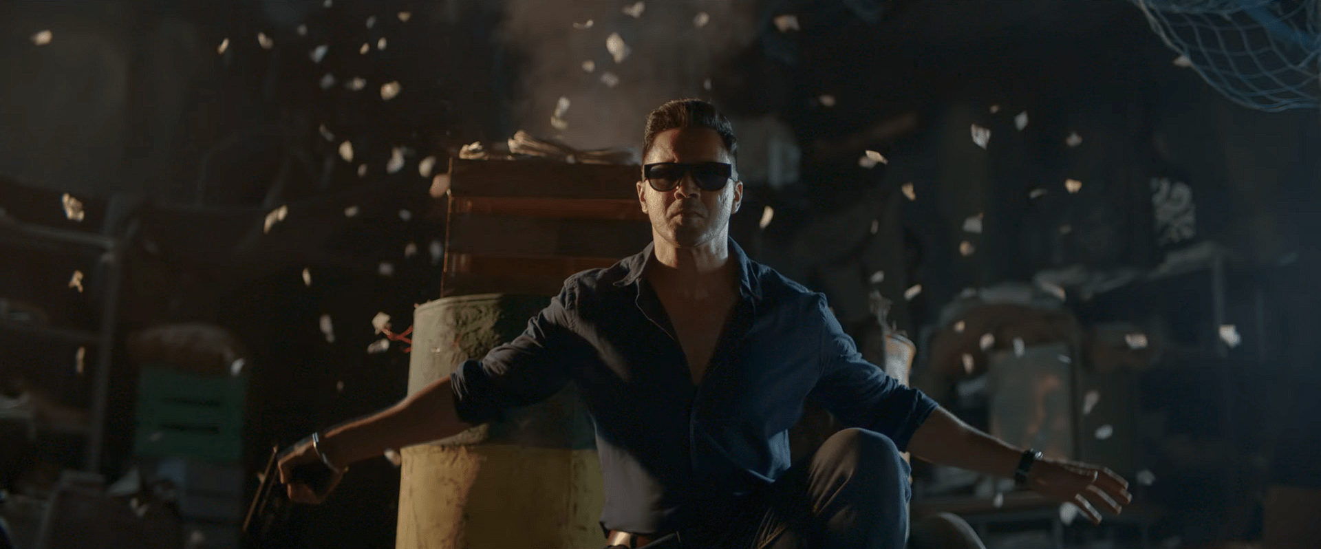 The film completely forgets planning and choreography. There is no clarity about where a character moves, what his objective is, or how he navigates the geography of a fight. Instead, the action looks like this: ten men shooting randomly from every angle, and Varun Dhawan stands in the middle – with zero protection – shooting them one by one like a superhero.
