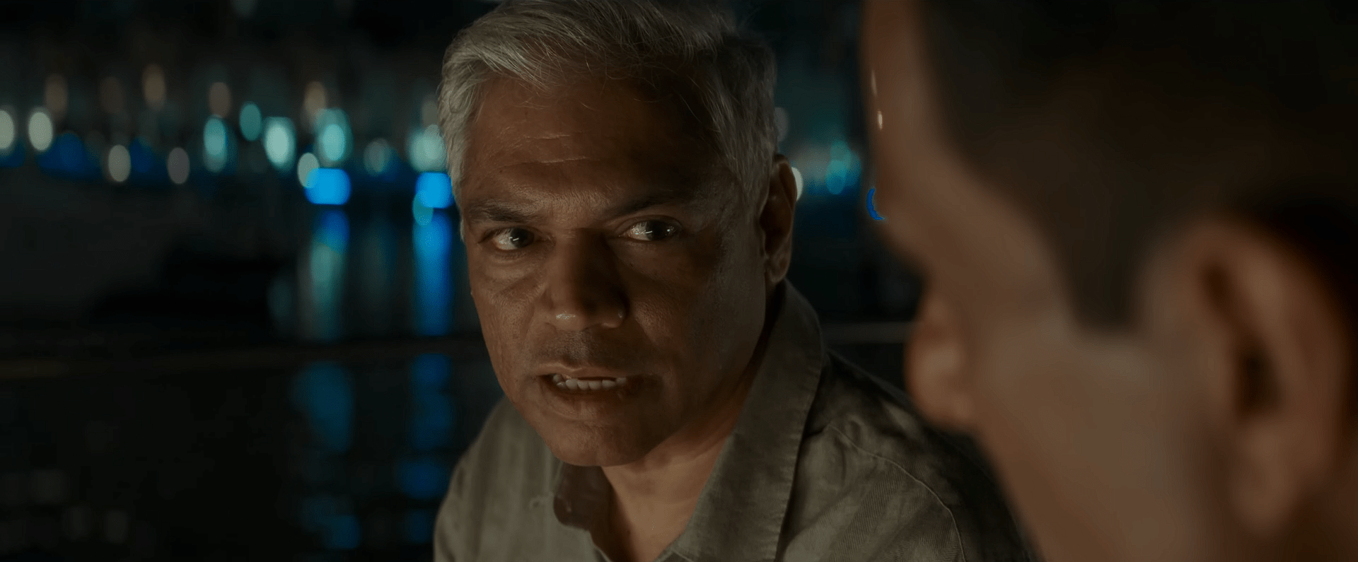 Ninety percent of his scenes show him sitting in front of a CGI screen, accompanied by a cleavage-heavy assistant, delivering lines that neither intimidate nor convince. The artificiality of the green-screened environment drains all authenticity from his presence.