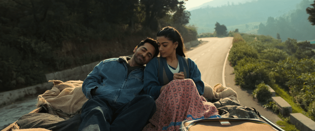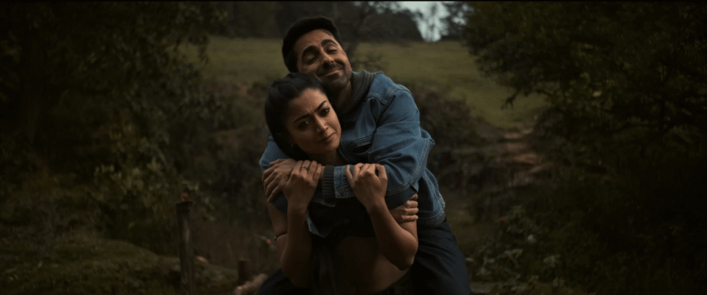 The film starts off simple enough. The lead character, played by Ayushmann Khurrana, goes on a trek in the jungle. At some point during his trek, he encounters a bear and is subsequently injured. After being rescued, he meets a woman (played by Rashmika Mandanna) who takes him to a group of people. At this point the story transitions from an adventure into a supernatural fantasy.