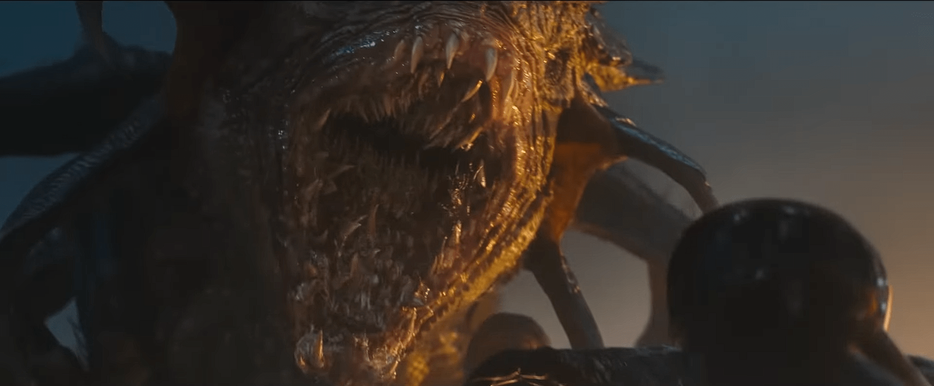 That’s it. The Dark Lord sends his forces across the galaxy to track them down. One of those monsters lands on Earth – a creature so powerful it can jump from the ground to a commercial airplane cruising at thousands of meters in the sky. Literally Superman-level launch physics. And yet, in the climax, this unstoppable cosmic warlord can’t catch a car. A normal car. Driven by Eddie Brock. Film logic here behaves like a drunk uncle at a wedding: loud, irrational, impossible to reason with.